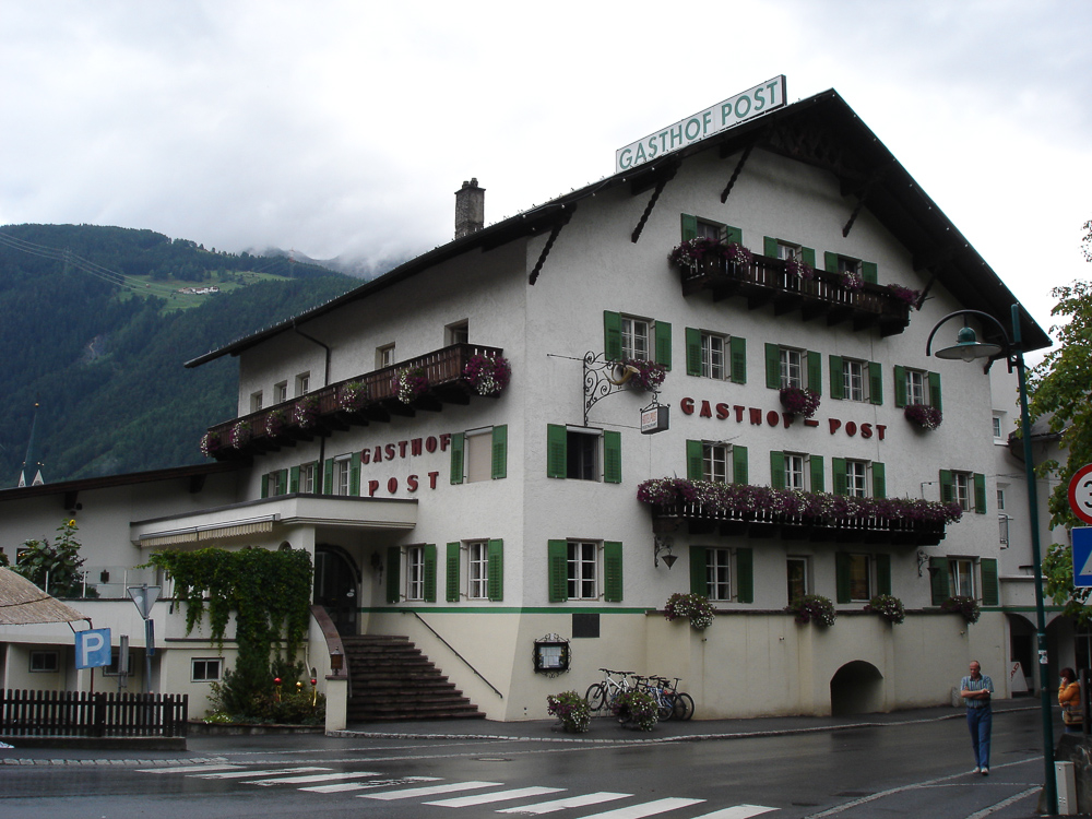 Der Hotelwirt macht uns keine Hoffnung: Richtung Nauders ist alles gesperrt, der Reschenpass ist viel zu gefährlich wegen Steinschlägen, die Norbertshöhe ist auch nicht besser. An Pfunds kämen wir wohl vorbei, aber dahinter kämen wir nicht weiter. Wir warten und warten und warten. Für alle Fälle hätte das Hotel zur Post noch Zimmer frei. Das ist ja auch schon etwas. Die Meldungen wechseln ständig: nach Nauders geht es heute vielleicht doch noch, dann wieder keinesfalls. Gegen ein Uhr überreden wir Sandra, dass sie doch noch einmal versuchen soll, einen Bus zu bekommen, der uns über den Brenner nach Nauders fährt. Das klappt auch, gegen zwei soll er hier sein. Wir warten und warten und nutzen die Zeit, eine anständige Portion Spaghetti Bolognese bzw. Lasagne zu verdrücken. Gegen halb drei trifft ein Bully ein, ein zweiter mit Anhänger soll noch kommen. Er trifft zehn Minuten später ein. Die Beratung mit den Fahrern ergibt, dass die Inntalautobahn zum Brenner gesperrt ist, sehr viele Straßen sind von Muren betroffen oder weggespült. Auch alle anderen Nord-Südverbindungen bis hin zur Felbertauernroute sind gesperrt. Der Regen der letzten Tage hat ganze Arbeit geleistet. Also wird es heute doch nichts damit, nach Nauders zu kommen. Mist. Wir beziehen also doch die Zimmer im Hotel zur Post und erkunden in 20 Minuten den gewaltigen Ort. Naja, dann schauen wir mal, wie es morgen wird. Irgendwie müssen wir morgen nach Nauders oder an die Etsch kommen. Vielleicht über den Brenner, vielleicht auch über den Reschenpass, aber das ist kaum zu erwarten.