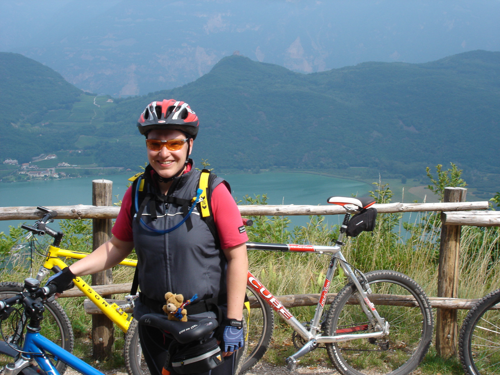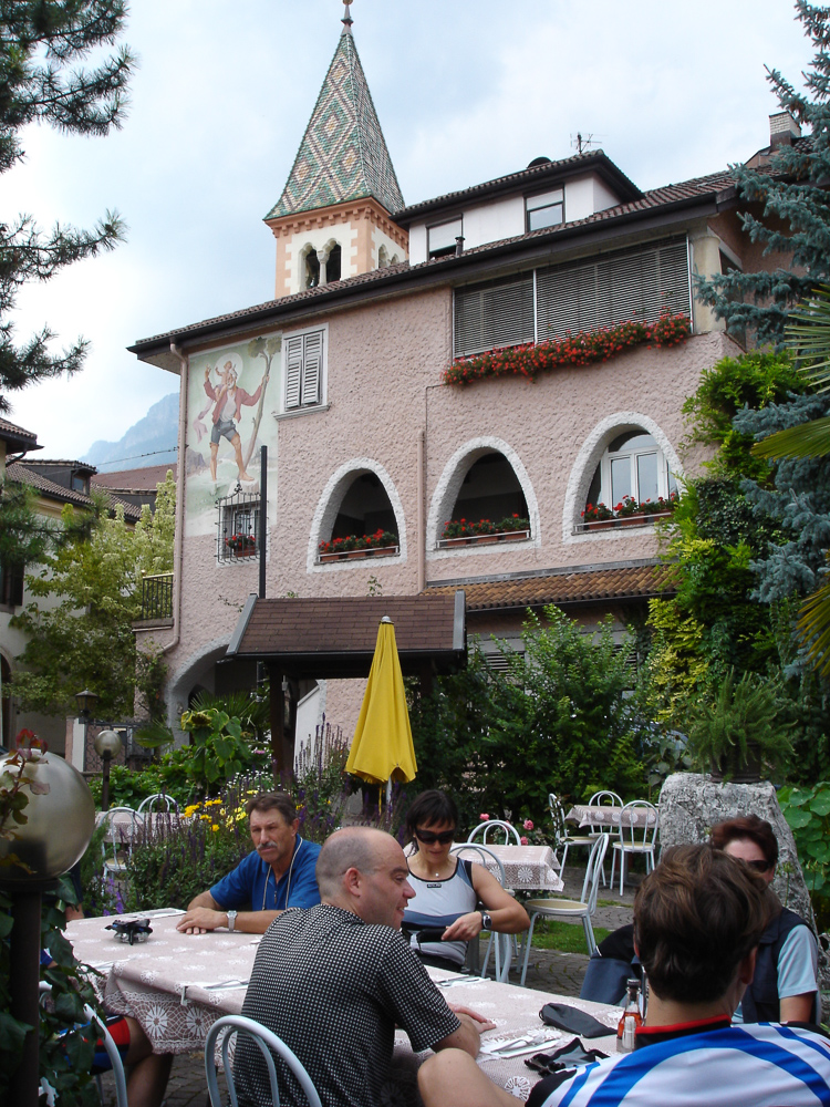Um 8.30 Uhr sitzen wir wieder auf dem Rad, und es geht über eine steile Schotterabfahrt herab nach Meran. In Meran machen wir eine halbe Stunde Stadtbummel und genießen noch einen latte macchiato, dann geht es auf Waalwegen bergauf und bergab weiter. Nach der Etappe vom Vortag ist es doch recht anstrengend, und wir freuen uns in Sankt Pauls auf unsere Jause. Leider kommt mein (ausgezeichnetes) Speckbrot erst mit erheblicher Verzögerung, so dass die Gruppe dieses Mal auch beim Essen auf uns warten muss, aber die unfreundlichen Bedienmausis geben ein willkommenes Feindbild für alle ab.