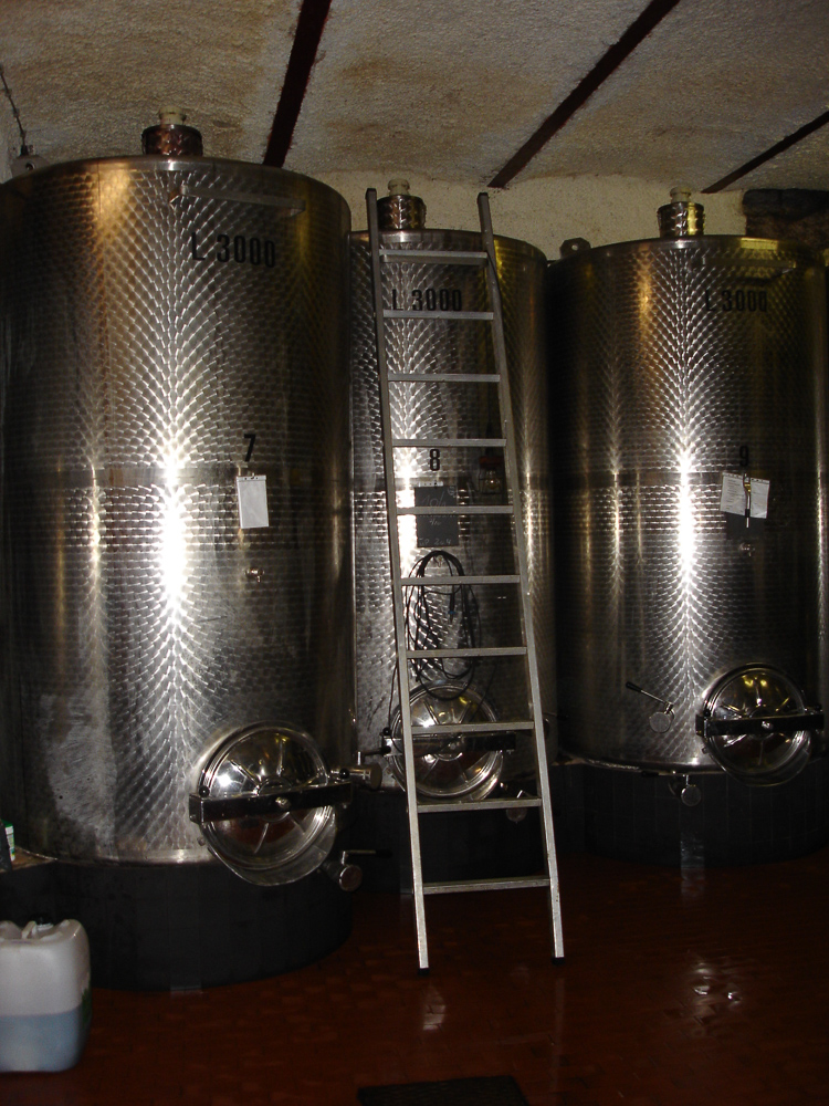 Auch nach der Pause geht es weiter auf und ab, an der Etsch durch endlose Apfelplantagen, am Berg durch Wein, und bald sehen wir auf den Kalterer See hinunter und sind kurz darauf in Tramin angekommen. Hier hat Alpstours eine Weinprobe mit Kellerbesichtigung organisiert. Der Winzer ist sehr sympathisch, und wir lernen viel über Südtiroler Weine: Blauburgunder liebt die Wärme, Chardonnay und Gewürztraminer klares Licht. Daher wächst der Blauburgunder in der Abendsonne am Osthang, der Weißwein in der Morgensonne am Westhang. Außerdem lernen wir, dass die Südtiroler Weißweine wenig Säure und keinerlei Restsüße haben, ein „normaler“ Kabinettwein bringt es auf 14 % bei 2 g Restsüße. Um ausschließlich restsüßefreie Weine zu erhalten, werden kaum Spät- und Auslesen erzeugt.