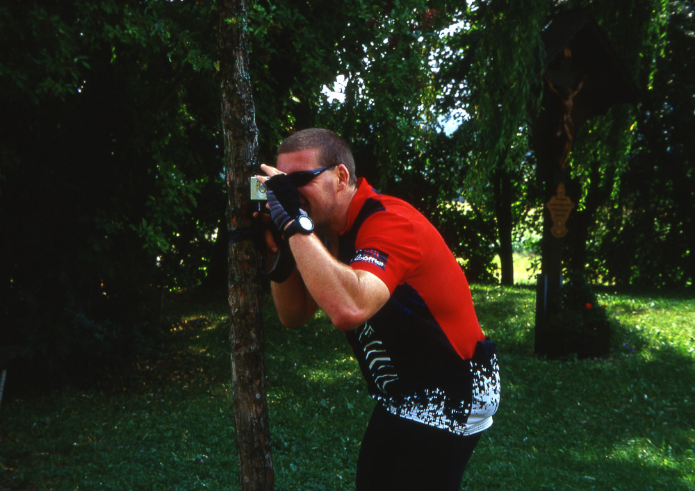 Der Weg geht senkrecht zur Steigung den Hang hoch, er scheint kein Ende zu nehmen. Ich gehe mal wieder etwas zu schnell an, trotz kleinster Übersetzung muss ich zweimal absteigen, um Luft zu holen. Oben steht eine Gruppe Radler, fehlt nur noch, dass sie mich anfeuern. Peinlich. Aber: Ich musste nicht schieben, sondern bin radelnd oben angekommen!